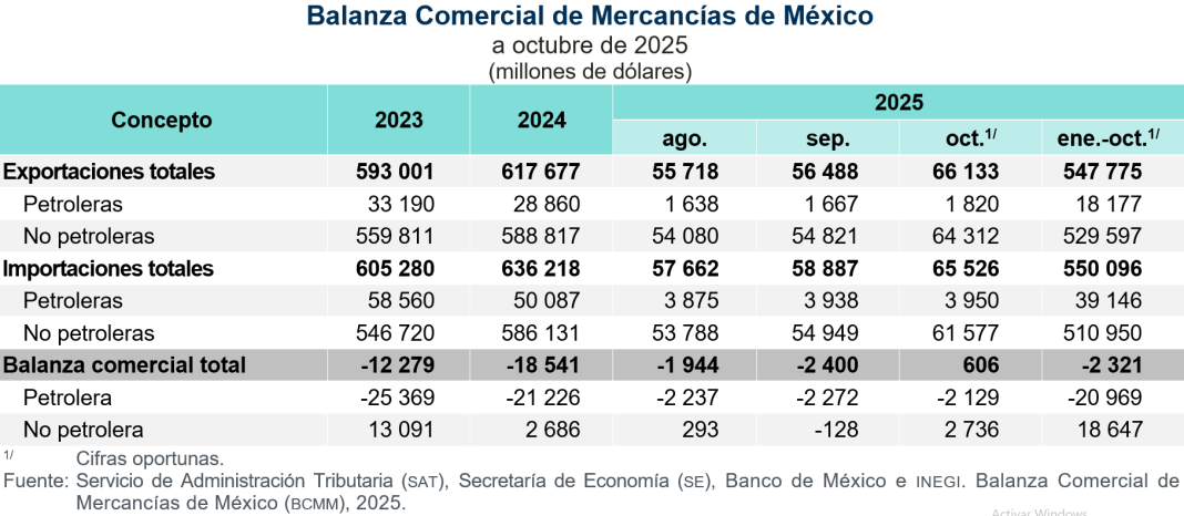En octubre de 2025, la información oportuna de comercio exterior registró un superávit comercial de 606 millones de dólares (mdd). Dicho saldo se compara con el déficit de 2 mil 400 mdd en septiembre. La ampliación del saldo comercial, entre septiembre y octubre, se originó de un aumento en el saldo de la balanza de productos no petroleros —que pasó de un déficit de 128 mdd, en septiembre, a un superávit de 2 mil 736 mdd, en octubre— y de un menor déficit de la balanza de productos petroleros —que pasó de 2 mil 272 mdd a 2 mil 129 mdd, en esa misma comparación—.