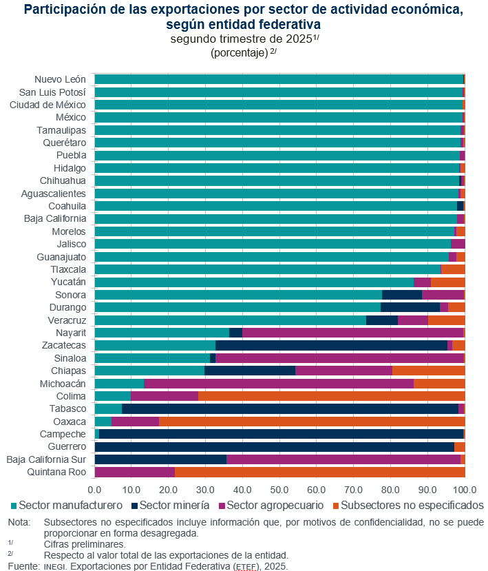 Al interior de las entidades federativas predominaron las exportaciones del sector manufacturero, con excepción de Baja California Sur, Guerrero, Campeche, Tabasco, Michoacán, Sinaloa, Zacatecas y Nayarit. En estas, sobresalieron las exportaciones del sector minero (petrolero y no petrolero) o del agropecuario.