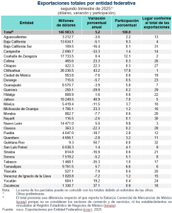 En el segundo trimestre de 2025, el valor de las exportaciones de las entidades federativas alcanzó un monto de 146 mil 983.5 millones de dólares.
