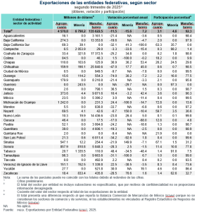 En el trimestre abril-junio de 2025, por sector de actividad económica, las exportaciones manufactureras representaron 92.3 % del valor total de las exportaciones de las entidades federativas. Siguieron las de minería (petrolera y no petrolera), con 4.6 %, y las del sector agropecuario, con 3.1 por ciento.