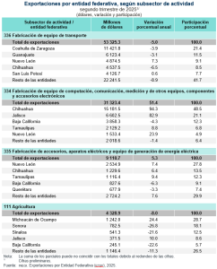 En minería, el subsector Extracción de petróleo y gas aportó 2.5 por ciento. Las exportaciones del subsector Agricultura representaron 2.9 por ciento. En conjunto, estos cinco subsectores sumaron 69.2 % de las exportaciones totales de las entidades.