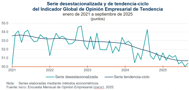 En septiembre de 2025 y con cifras desestacionalizadas, el IGOET —que es el promedio ponderado de los indicadores de los cuatro sectores que lo integran— fue de 50.4 puntos y representó un alza de 0.4 puntos en relación con el mes anterior. En su comparación anual disminuyó 0.9 puntos. Con esta última observación, el indicador suma 64 meses seguidos por encima del umbral de los 50 puntos.