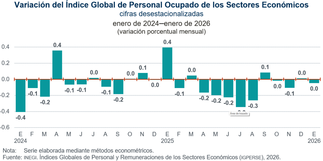 En enero de 2026 y con cifras ajustadas por estacionalidad, el IGPOSE alcanzó un nivel de 97.9 puntos: a tasa mensual no mostró variación, a tasa anual disminuyó 1.3 %.