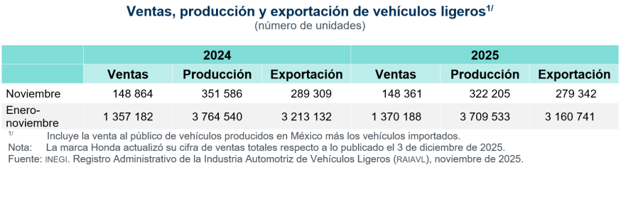 El siguiente cuadro presenta las cifras de las unidades que se vendieron, produjeron y exportaron en noviembre 2025, así como las referentes al periodo enero a noviembre de 2024 y 2025.
