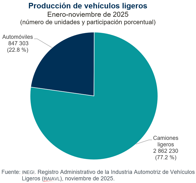 Durante el periodo enero a noviembre de 2025, se produjeron 3 millones 709 mil 533 unidades, lo que representó una variación de -1.5 %, respecto al mismo lapso de 2024. Durante el periodo citado, los camiones ligeros representaron 77.2 % del total producido, mientras que el resto correspondió a la fabricación de automóviles.