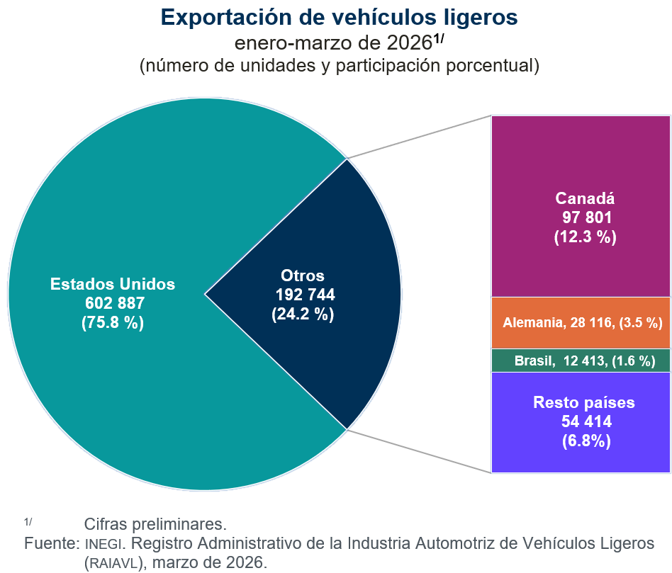Durante el periodo de enero a marzo de 2026 se exportaron 795 mil 631 unidades, lo que representó una variación de 2.5 % respecto al mismo lapso de 2025. Estados Unidos fue el principal destino de las exportaciones de vehículos ligeros, con 75.8 %.