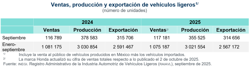 El siguiente cuadro presenta las cifras de las unidades que se vendieron, produjeron y exportaron en septiembre 2025, así como las referentes al periodo enero a septiembre de 2024 y 2025.