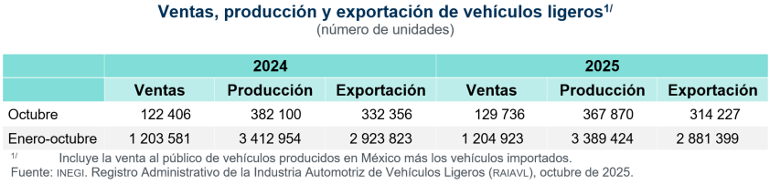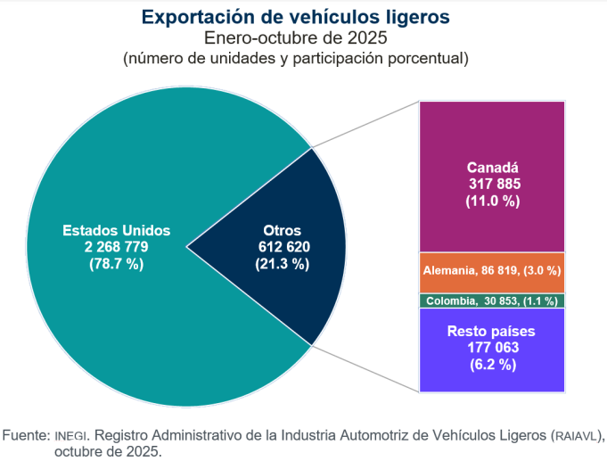 En el periodo enero a octubre de 2025 se exportaron 2 millones 881 mil 399 unidades, lo que representó una variación de -1.5 %, respecto al mismo lapso de 2024. Estados Unidos fue el principal destino de las exportaciones de vehículos ligeros con 78.7 %.