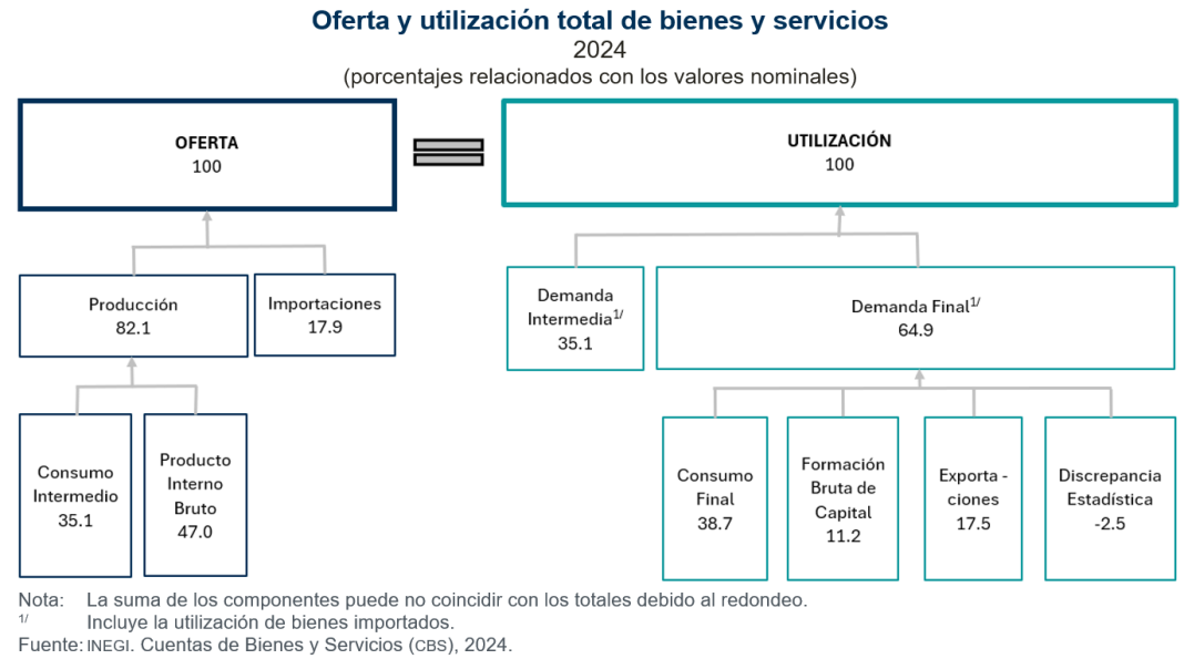 La producción total a precios de mercado que generó el país fue de 58 billones 487 mil 053 mdp en el año de referencia. Respecto a la oferta total, el valor de la producción de bienes y servicios que se destinaron para el consumo intermedio constituyó 35.1 % y el Producto Interno Bruto (PIB) -es el valor monetario de los bienes y servicios finales producidos por una economía en un periodo determinado dentro del país-, 47.0 %.