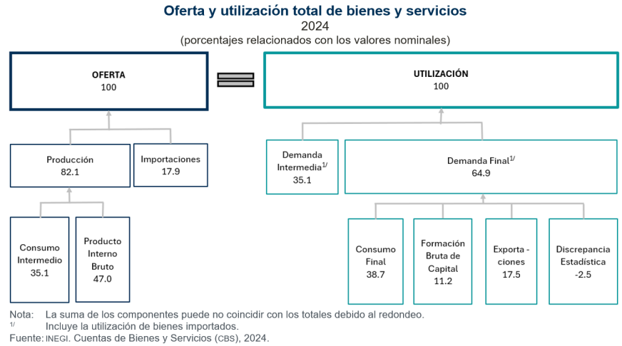 Durante 2024, la oferta total de bienes y servicios —que es igual a la utilización total— se ubicó en 71 billones 267 mil 330 millones de pesos (mdp) corrientes a precios de mercado -precios de bienes y servicios valorados en el establecimiento de venta; en estos se incluyen los gastos de transporte y los impuestos netos a los productos, como el Impuesto al Valor Agregado-.