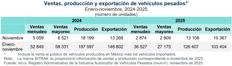 Para los meses de enero a noviembre de 2025, se exportaron 103 mil 404 unidades, lo que representó una variación de -30.5 % respecto al mismo lapso de 2024. Estados Unidos fue el principal destino de las exportaciones de vehículos pesados, con 94.4 % del total.