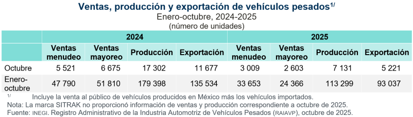 Para los meses de enero a octubre de 2025, se exportaron 93 mil 037 unidades, lo que representó una variación de -31.4 % respecto al mismo lapso de 2024. Estados Unidos fue el principal destino de las exportaciones de vehículos pesados, con 94.3 % del total.