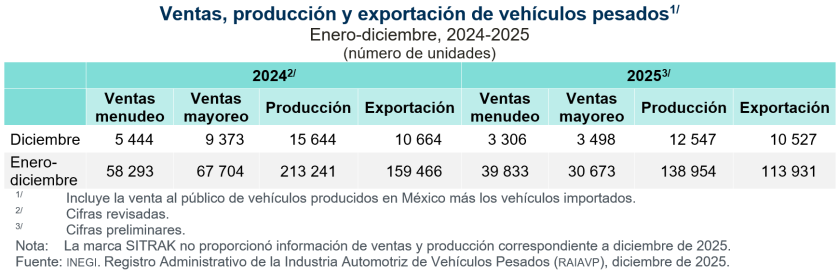 Durante los meses de enero a diciembre de 2025, se produjeron 138 mil 954 vehículos pesados, lo que representó una variación de -34.8 %, respecto al mismo lapso de 2024.