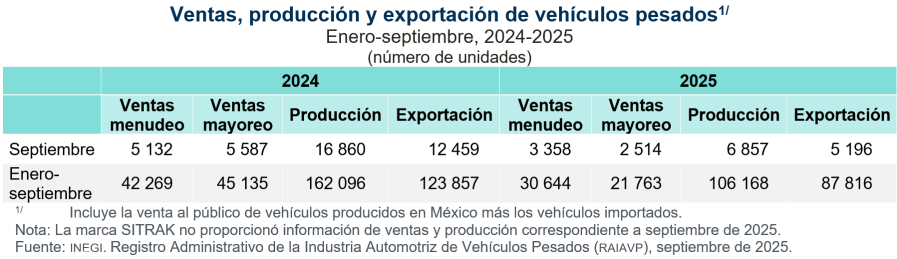 Durante los meses de enero a septiembre de 2025, se produjeron 106,168 vehículos pesados, lo que representó una variación de -34.5 %, respecto al mismo lapso de 2024.