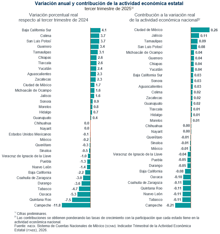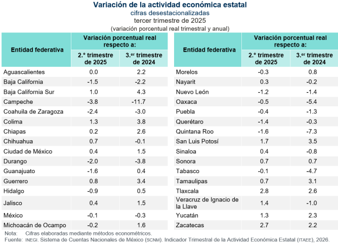 Durante el tercer trimestre de 2025 y con cifras ajustadas por estacionalidad, las entidades federativas que registraron los mayores crecimientos en su actividad económica, a tasa trimestral, fueron Tlaxcala, con 2.8 %; Zacatecas, con 2.7 %; San Luis Potosí, con 1.7 %; Veracruz, con 1.4 %; y Colima y Yucatán, con 1.3 por ciento.