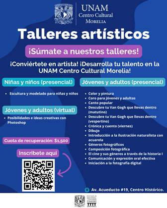 Para mayores informes y consultar toda la oferta de talleres, puedes comunicarte al Facebook UNAM Centro Cultural Morelia, escribir al correo electrónico gcruz@enesmorelia.unam.mx, o al WhatsApp 4434 100 517.
