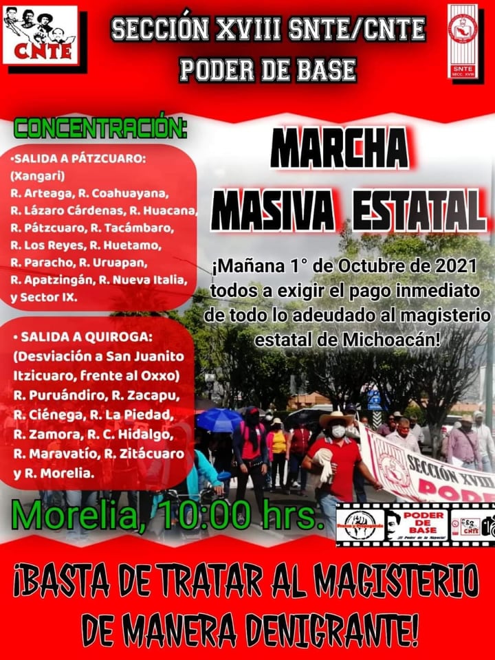 Y a pesar del acuerdo logrado de pagos para el mes entrante tanto de los salarios como de los bonos, la CNTE-Poder de Base tiene preparada una marcha masiva con agremiados venidos de las 22 regiones magisteriales para este 1 de octubre, para lo cual se concentrarán en las salidas a Quiroga y a Pátzcuaro desde temprana hora.