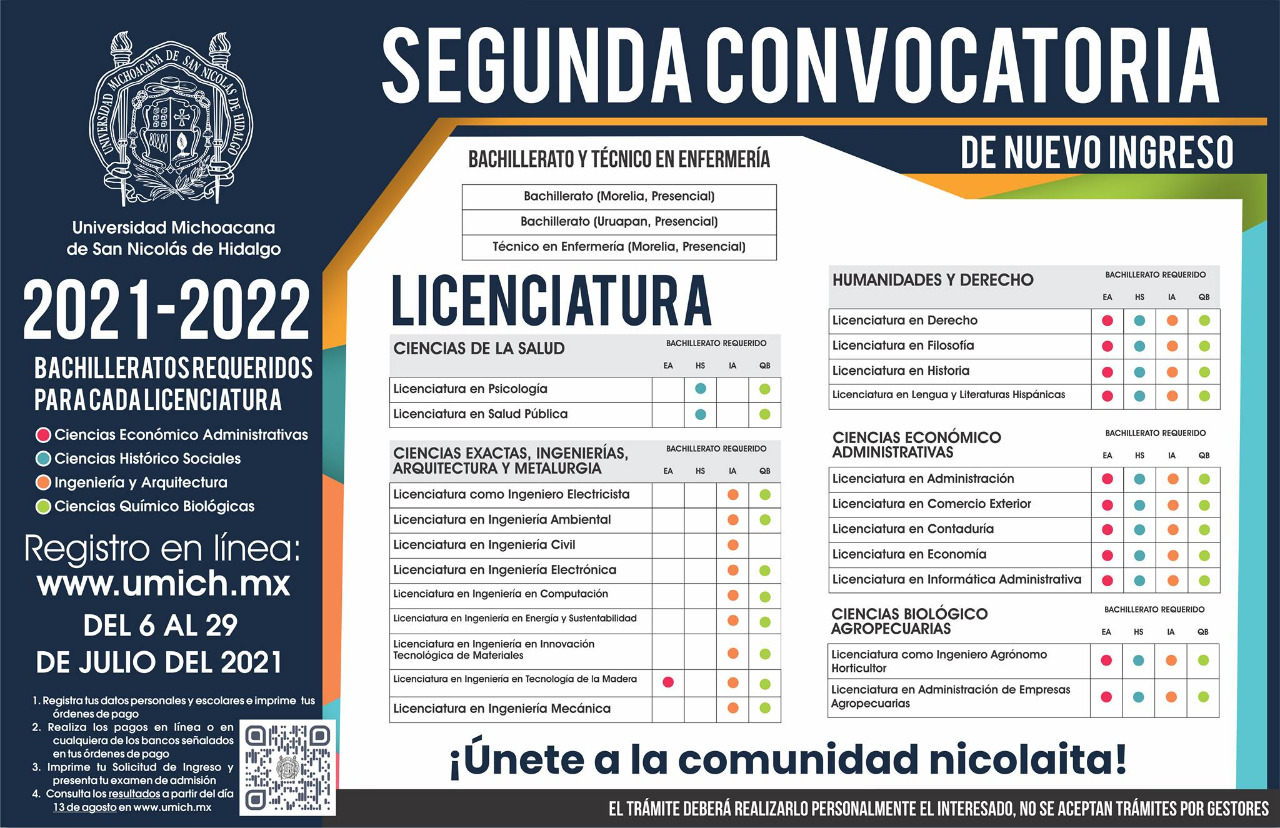 Las carreras que incluyen cupo disponible en la UMSNH son Salud Publica, Psicología (Ciudad Hidalgo) así como el nivel técnico en Enfermería en lo que es el Área de la Salud, en tanto para el Área de Ingenierías y Ciencias Exactas hay cupo en Ingeniería Civil, Ingeniería Eléctrica, Electrónica, Tecnología de la Madera, Ingeniería Mecánica, Ingeniería en Computación, Innovación Tecnológica de Materiales, Energía y Sustentabilidad, e Ingeniería Ambiental.