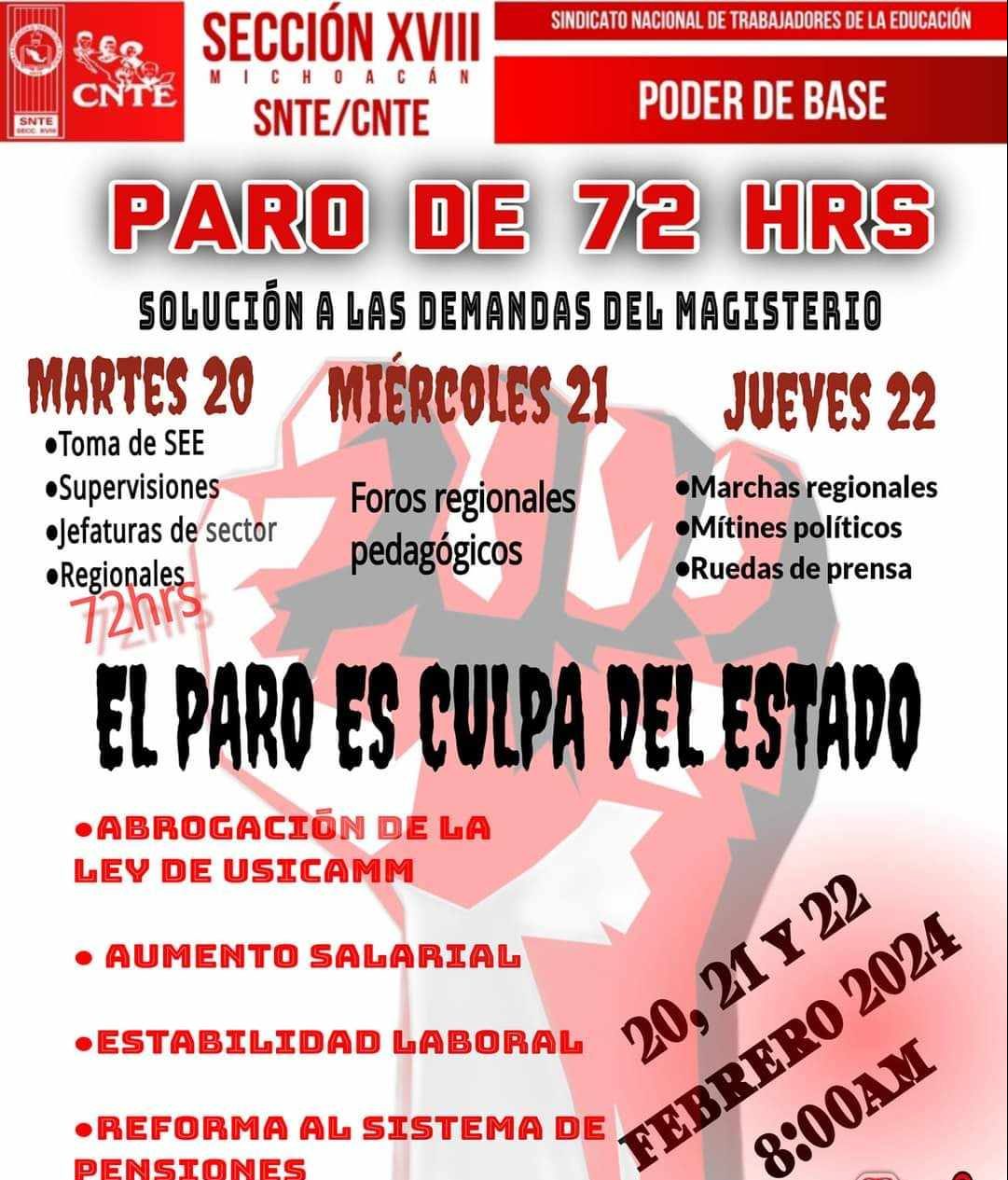 Esta jornada ha comenzado en punto de las 8:00 horas de este 20 de ebrero. Sus demandas centrales son el 50 por ciento de aumento salarial, estabilidad laboral para los trabajadores de la educación no regularizados, reforma al sistema de Pensiones para alcanzar una retribución digna, y abrogación de la Ley UESICAMM y sus procesos de ingreso al Servicio Profesional Docente.