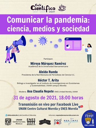La sesión de agosto del ciclo de Cafés Científicos que realiza el Centro Cultural de la UNAM en Morelia llevará por tema central “Comunica la pandemia: ciencia, medios y sociedad”. Esta charla está dirigida a todo público interesado en conocer y dialogar sobre el rol que los periodistas y medios de comunicación han tenido en este tiempo en la comunicación de la pandemia. La sesión se realizará este martes 31 de agosto a las 18:00 horas a través de las páginas de Facebook del UNAM Centro Cultural y de la ENES Unidad Morelia.