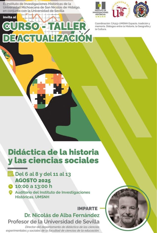 El Instituto de Investigaciones Históricas de la Universidad Michoacana de San Nicolás de Hidalgo (UMSNH), ha preparado en conjunto con la Universidad de Sevilla, un especial curso-taller titulado “Didáctica de la historia y las ciencias sociales”, el cual será impartido de manera gratuita por el Doctor Nicolás de Alba-Fernández.