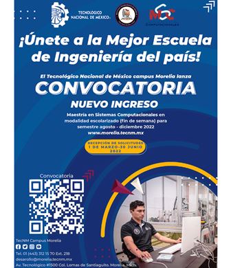 El Tecnológico Nacional de México, campus Instituto Tecnológico de Morelia, abre su convocatoria de nuevo ingreso para la Maestría profesionalizante en Sistemas Computacionales, desde el primero de marzo al 30 de junio próximo.
