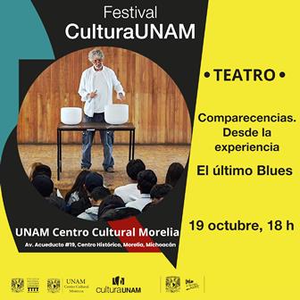 El festival llegará a la ciudad de Morelia el próximo 19 de octubre, con la presentación de la compañía teatral “El último Blues”, quienes vendrán desde Ciudad de México para presentar el espectáculo escénico “Comparecencias. Desde la experiencia”, un profundo programa teatral que aborda los temas de la violencia y las adicciones, que inicia con el diálogo para hablar de los factores de riesgo, la prevención y atención. El objetivo de esta propuesta es mostrar la importancia de la cultura de paz, la reflexión y la meditación.