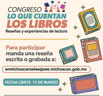 La extensión de las reseñas escritas deberá ser de una a tres cuartillas, escritas a mano con letra legible o en procesador de textos; en el caso de los videos o audioreseñas, su duración deberá ser entre 40 y 90 segundos. Se deberán enviar al correo electrónico enmichoacanselee@see.michoacan.gob.mx; la fecha límite es el 15 de marzo.