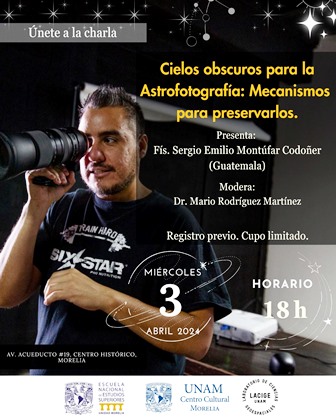 Por primera vez el reconocido astrofotógrafo Sergio Montúfar (Guatemala) llega al UNAM Centro Cultural Morelia, de la Escuela Nacional de Estudios Superiores (ENES Morelia UNAM), con la charla “Cielos obscuros para la Astrofotografía: Mecanismos para preservarlos” el próximo miércoles 03 de abril a las 18 horas.
