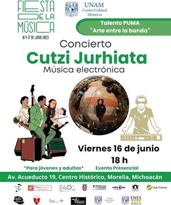 La Fiesta de la Música y el ciclo “Talento Puma. Arte entre la banda”, que tiene como objetivo promover y difundir el talento artístico de las y los estudiantes de la ENES Morelia, se fusionan para presentar el concierto de música electrónica a cargo de la gran artista Cutzi Jurhiata, estudiante de la licenciatura en Música y Tecnología Artística, y ganadora de la medalla al mérito juvenil 2023, que otorga el Instituto de la Juventud Moreliana, por su labor en el ámbito artístico y cultural.