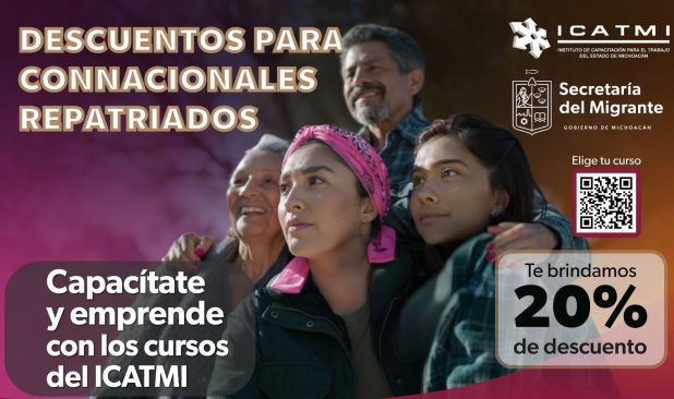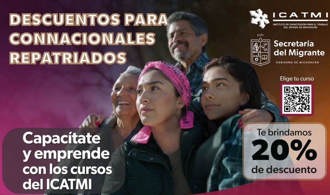 El Instituto de Capacitación para el Trabajo del Estado de Michoacán (Icatmi) ofrece un 20 por ciento de descuento en más de 850 cursos y talleres a connacionales repatriados, tras la renovación de la colaboración con la Secretaría del Migrante (Semigrante).