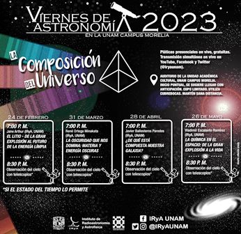 El Instituto de Radioastronomía y Astrofísica (IRyA) de la UNAM, Campus Morelia, invita al ciclo de Viernes de Astronomía del primer semestre de 2023. En este ciclo, las y los académicos del IRyA comparten pláticas dirigidas al público en general sobre diversos temas astronómicos, y se realiza observación del cielo con telescopios con apoyo de las y los estudiantes del posgrado en Astrofísica del IRyA.