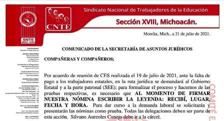 El Comité Ejecutivo Seccional, es decir la dirigencia, de la CNTE-Poder de Base acordó interponer una demanda legal en contra de Silvano Aureoles por la serie de incumplimientos laborales y de pagos para con el magisterio de adscripción estatal como fue la dispersión muy retrasada de esta primera quincena de Julio, para lo cual debieron movilizarse, incluso, todos los gremios educativos porque no les fue depositada el día 15 como lo marca la ley.
