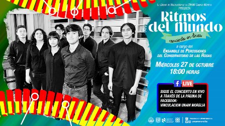 El Programa Artístico a Distancia a cargo de la Unidad de Vinculación del Campus UNAM Morelia, presenta el concierto “Ritmos del mundo” con la participación de los músicos del Ensamble de Percusiones del Conservatorio de las Rosas, el próximo 27 de octubre, a las 6:00 de la tarde a través de una transmisión gratuita en el Facebook: Vinculación UNAM Morelia