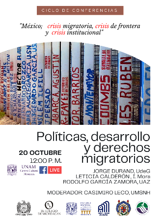 Estas y otras preguntas más serán algunos de los ejes centrales de la Conferencias del día 20 de octubre (12:00 h) “Políticas, desarrollo y derechos migratorios” con la participación de los Doctores Jorge Duran (UdeG), Leticia Calderón (I. Mora) y Rodolfo García Z. (U.A.Z.) y el día 21 (17:00 h) “Frontera norte, frontera sur y tránsitos por México” con la participación de los Doctores Martha Rojas (ECOSUR) Rafael Alarcón (COLEF) y la Maestra Berenice Valdez (IMUMI).