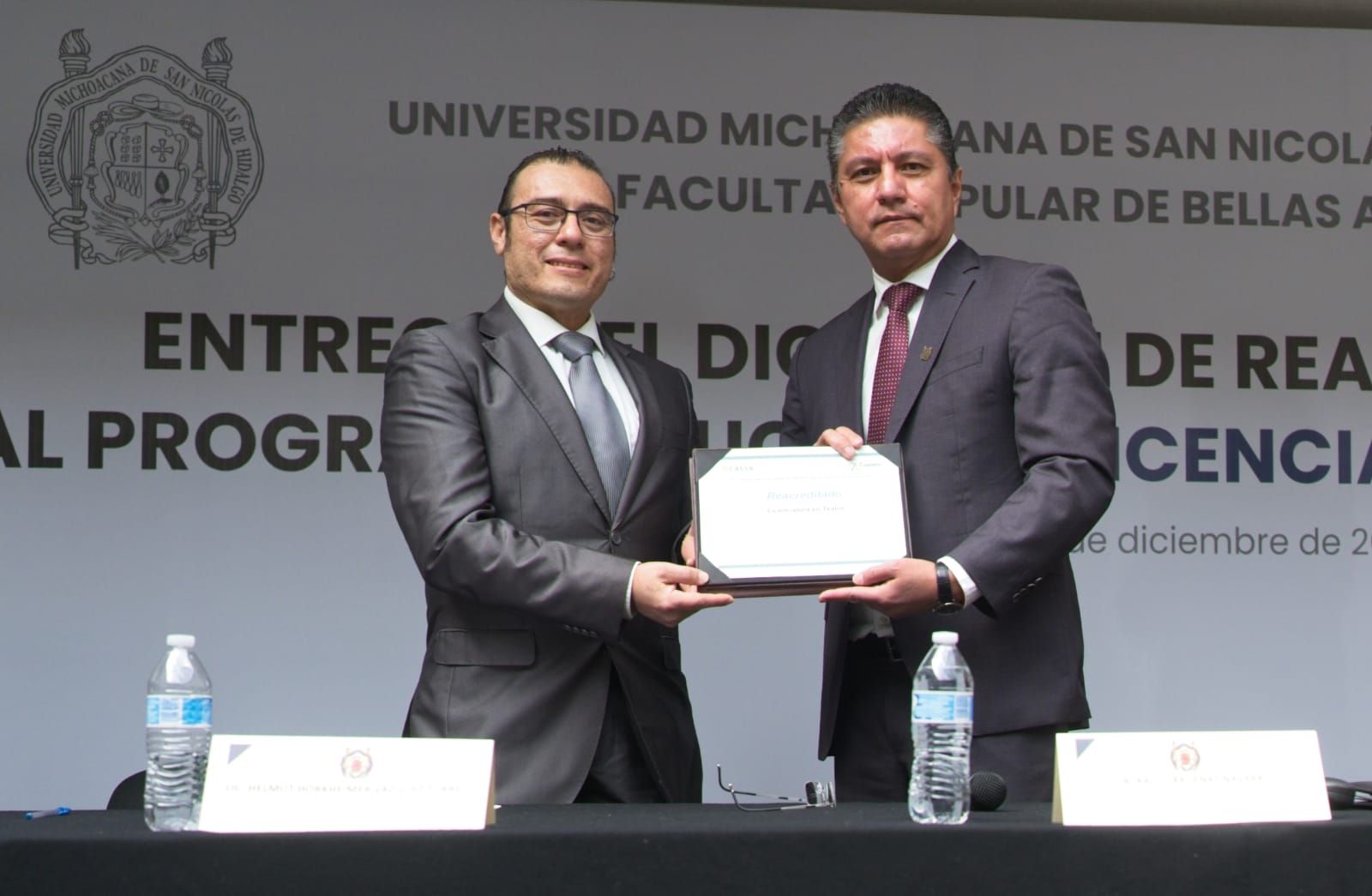 La reacreditación fue emitida por el Consejo para la Acreditación de la Educación Superior de las Artes, A.C., organismo reconocido por el Consejo para la Acreditación de la Educación Superior A.C. (COPAES), quien dictaminó la calidad y excelencia de este programa educativo que ofrece la Universidad Michoacana de San Nicolás de Hidalgo.