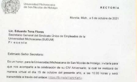 El Sindicato Único de Empleados de la Universidad Michoacana ha rechazado esta tarde la invitación del rector Raúl Cárdenas Navarro al acto del CIV Aniversario de la UMSNH, que será en Colegio de San Nicolás este Viernes en qué es la importante fecha para la institución.
