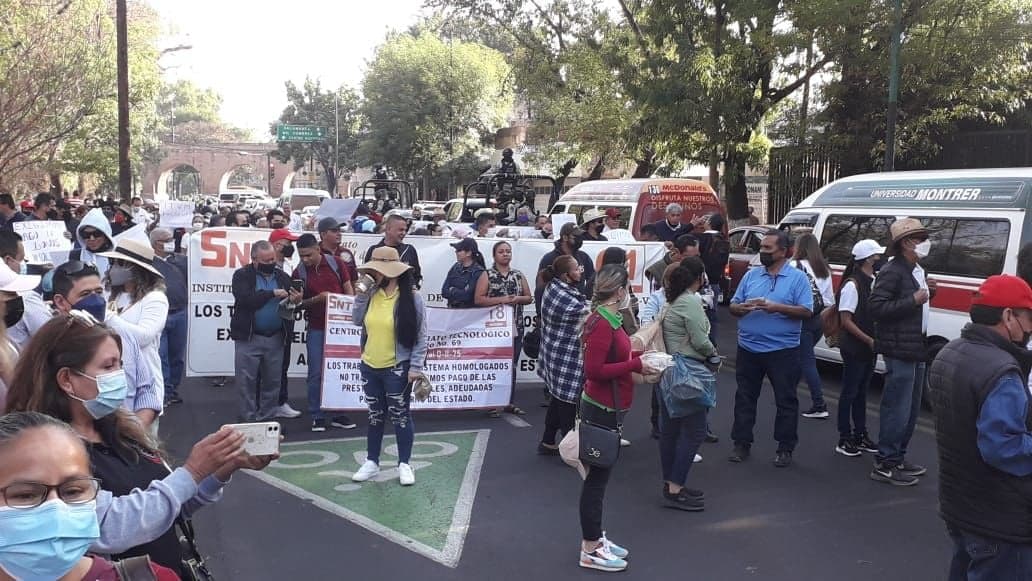Gobierno estatal adeuda cerca de 70 millones de pesos a 6 mil trabajadores homologados de diversas dependencias educativas del nivel medio superior y superior, entre ellos de los institutos tecnológicos, quienes pertenecen al Sindicato Nacional de Trabajadores de la Educación. Han tomado por esa razón hoy la Secretaría de Finanzas en demanda de pagos de prestaciones pendientes, donde permanecen bloqueando desde esta mañana el paso vehicular.