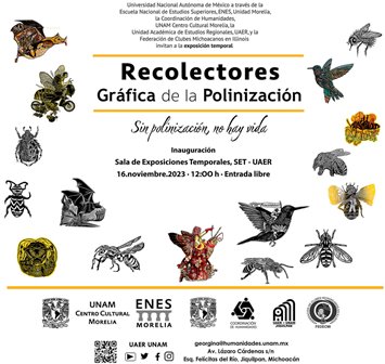 “Recolectores: Gráfica de la polinización” es una exposición organizada por la FEDECMI, LANASE, la ENES UNAM Morelia y los distintos colectivos y artistas participantes y está dirigida a la comunidad migrante, a la comunidad científica y al público en general. Tomando el arte como un medio para generar conciencia de la relevancia para la subsistencia humana de los polinizadores.