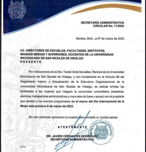 Ello, mediante documento de la Secretaría Administrativa de la UMSNH, dirigido también a mandos medios, por el Día Internacional de la Mujer