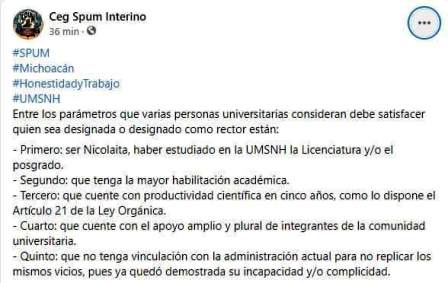 Así, de entre los parámetros que «varias personas universitarias», consideran, debe satisfacer quien sea designado como el próximo jefe nicolaita son cinco: