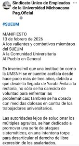 En un manifiesto hecho publicar este viernes 13 de febrero la dirigencia sueumista cuestiona «lo inverosímil que resulta que una institución como la UMSNH se encuentra acéfala desde hace poco más de tres años debido a que desde la llegada de Yarabí Ávila a la Rectoría no solo se ha carecido de voluntad para enfrentar las problemáticas, también se ha obrado con medidas dolosas en contra de los trabajadores universitarios», acusa.
