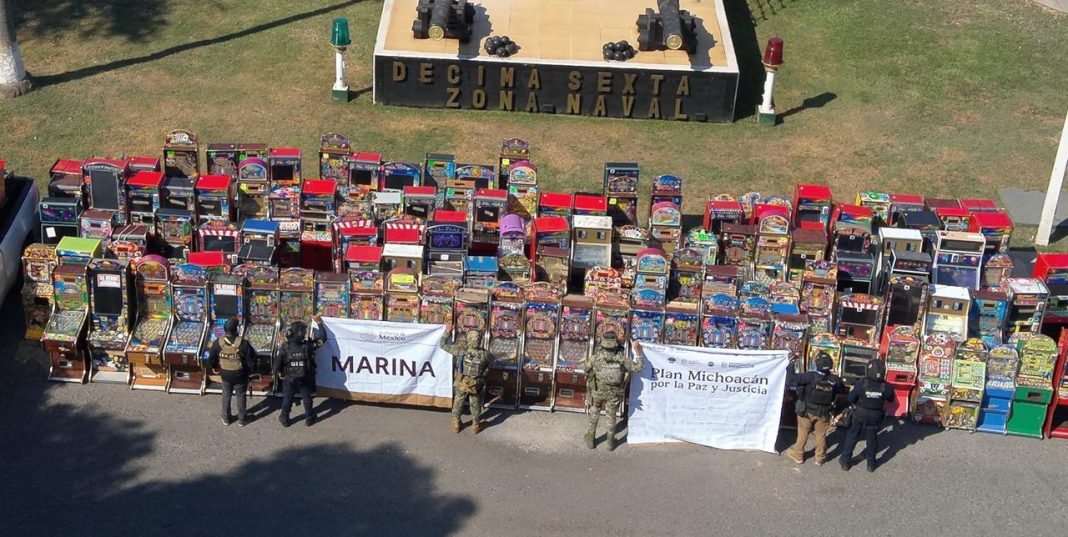 Lázaro Cárdenas, Michoacán.- En un operativo conjunto, elementos de las secretarías de Seguridad Pública (SSP) y de Marina (Marina), en apoyo a la Fiscalía General del Estado (FGE), aseguraron 183 máquinas tragamonedas en el municipio de Lázaro Cárdenas. La acción derivó de la cumplimentación de 13 órdenes de cateo en diversos inmuebles y una intervención adicional en flagrancia.