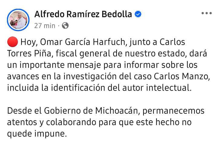 Atentos y colaborando para que no quede impune el homicidio de Carlos Manzo, postea Alfredo Ramírez Bedolla, en transmisión de Harfuch.