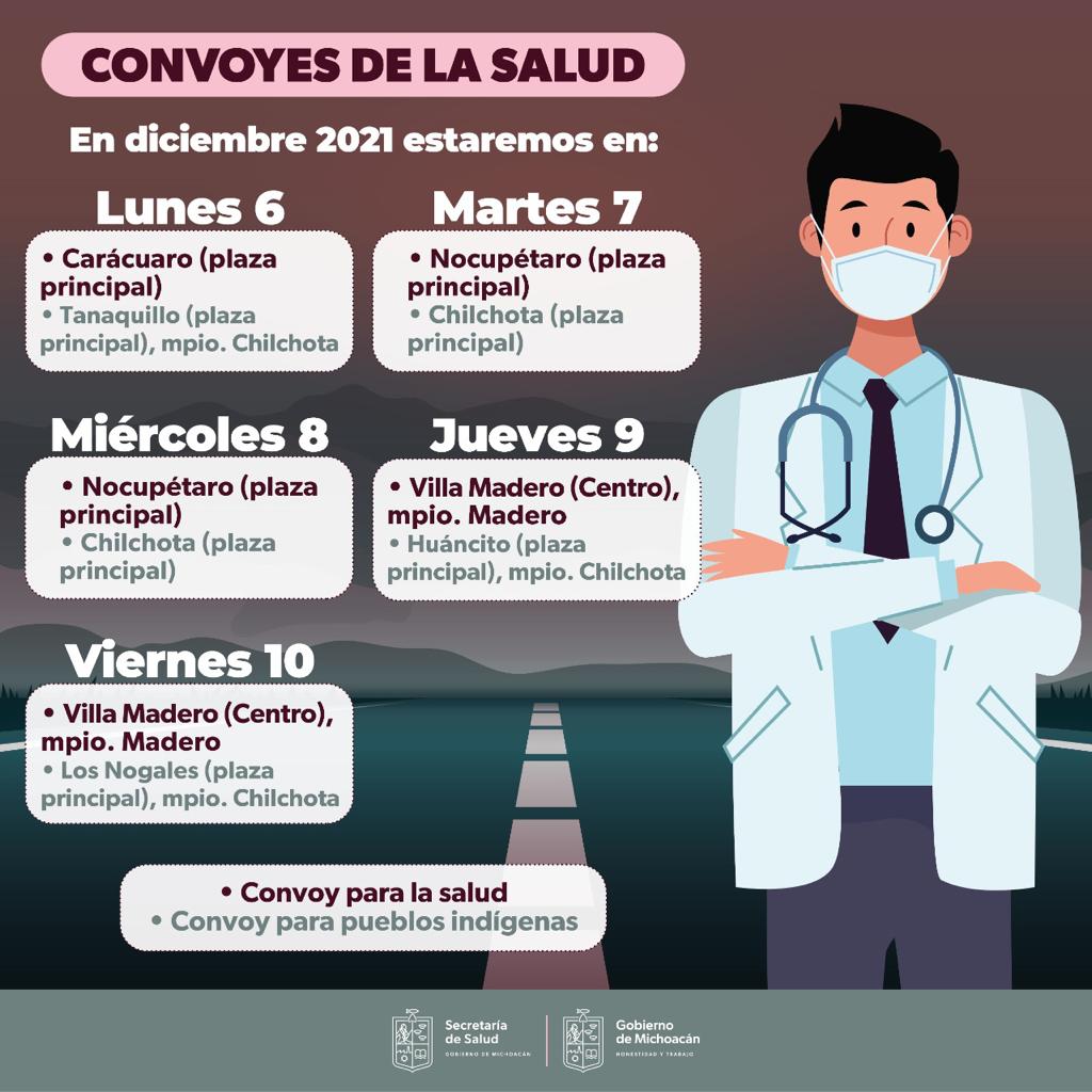 Los Convoyes de la Salud estarán en el centro de Villa Madero el jueves 9 y 10 de diciembre, y el día 9 de diciembre en la plaza principal de Huáncito, municipio de Chilchota y el viernes 10 de diciembre en la plaza principal de Los Nogales.