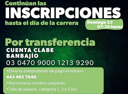 Para inscribirse en línea, pueden transferir a la Cuenta Clabe 030470900012139290 y enviar su comprobante de pago y datos (nombre completo, talla de playera, ruta a correr) al WhatsApp 443 492 7640 y pasar a recoger su kit antes de las 17:00 horas el sábado 22 de abril.