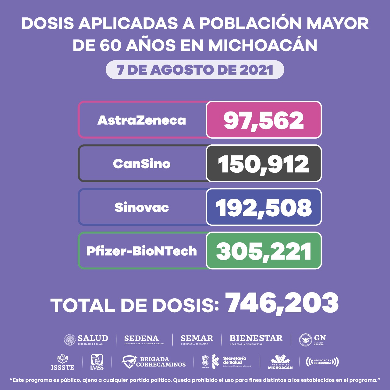 En el grupo de población mayor de 60 años se tiene un registro de aplicación de 746 mil 203 dosis, seguido por el de 50 a 59 con 563 mil 583 y el de 40 a 49 con 510 mil 885 dosis de diferentes farmacéuticas.