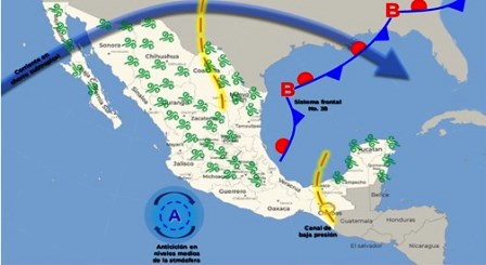Así mismo, un canal de baja presión sobre Coahuila originará fuertes rachas de viento con posibles tolvaneras en zonas del noreste del país. Finalmente, una circulación anticiclónica en niveles medios de la atmósfera mantendrá ambiente cálido a caluroso y escasa probabilidad de lluvia sobre gran parte de la República Mexicana.