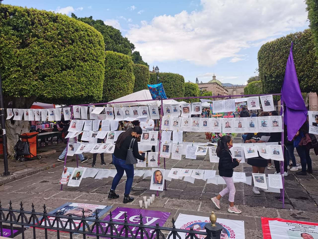 Esta tarde se dieron cita algunas de ellas, pero todas jóvenes, cerca del quiosco pero ubicadas hacia la avenida Madero dónde colgaron hilos de los que pendían hojas impresas con el nombre, rostro y hasta la cantidad que adeuda a las afectadas el susodicho padre que no se ha querido hacer cargo del o de los hijos, y a donde llamaban a la gente a que se acercasen «a conocer» y a ver a estos morosos.