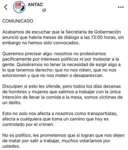 Rosa Icela Rodríguez, secretaria de Gobernación, dio una conferencia de prensa hace unas horas solo para afirmar que se mantiene el diálogo con los transportistas y agricultores, y que no hay razón para la movilización y bloqueos carreteros de hoy. Pero ha ofrecido sentarse a nueva mesa.